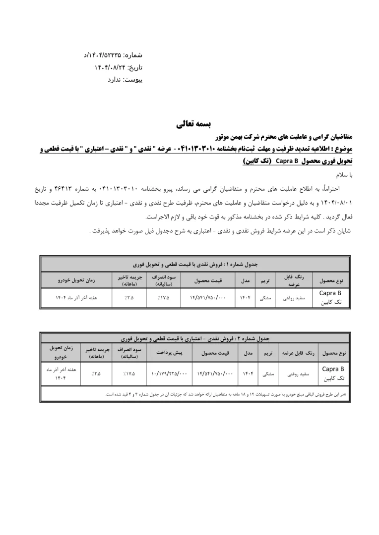 اطلاعیه تمدید ظرفیت و مهلت ثبت نام کاپرا تک کابین